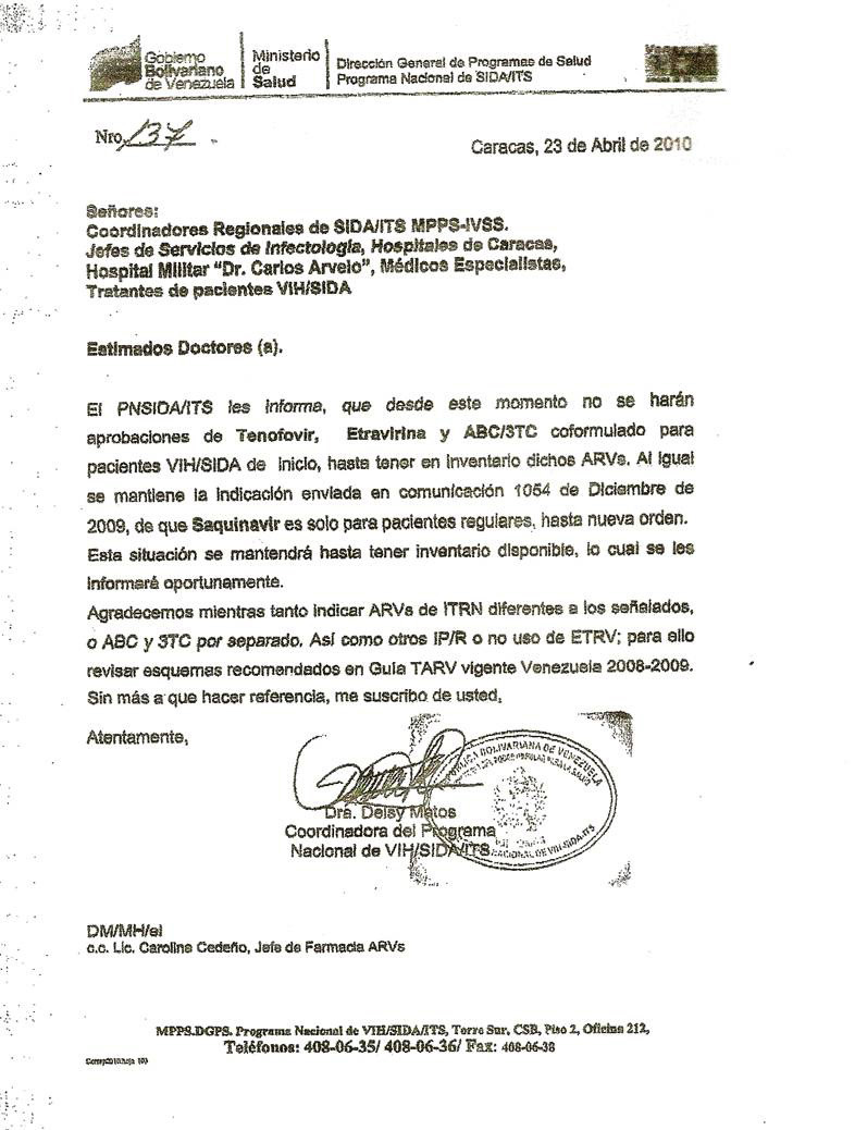 De acuerdo con un oficio del Ministerio de Salud número 137, de fecha 23 de abril de 2010, presentado por el presidente de StopVIH, Jhonatan Rodríguez, se prohíbeprescribir algunos medicamentos antirretrovirales a los nuevos usuarios, con lo que se expone a los nuevos usuarios al tratamiento del que disponga el Programa Nacional de VIH y Sida y no al que estas personas necesitan y al que tienen derecho.