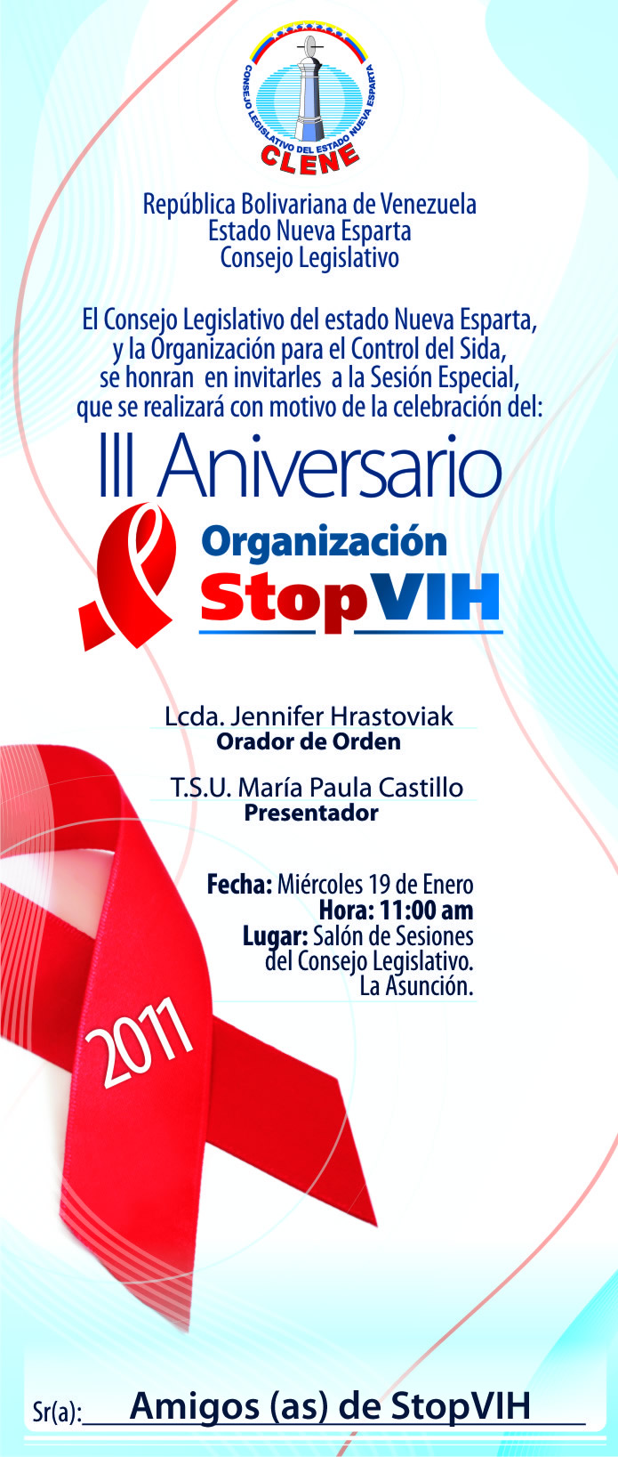 El presidente de StopVIH aprovechó la oportunidad para invitar a todas las fuerzas vivas del estado Nueva Esparta, medios de comunicación, aliados, colaboradores y toda la comunidad en general que apoya la gestión de la ONG, a este acto especial a realizarse en el Salón de Sesiones del Consejo Legislativo en la ciudad de La Asunción el miércoles 19 de enero de 2011 a las 11 de la mañana.