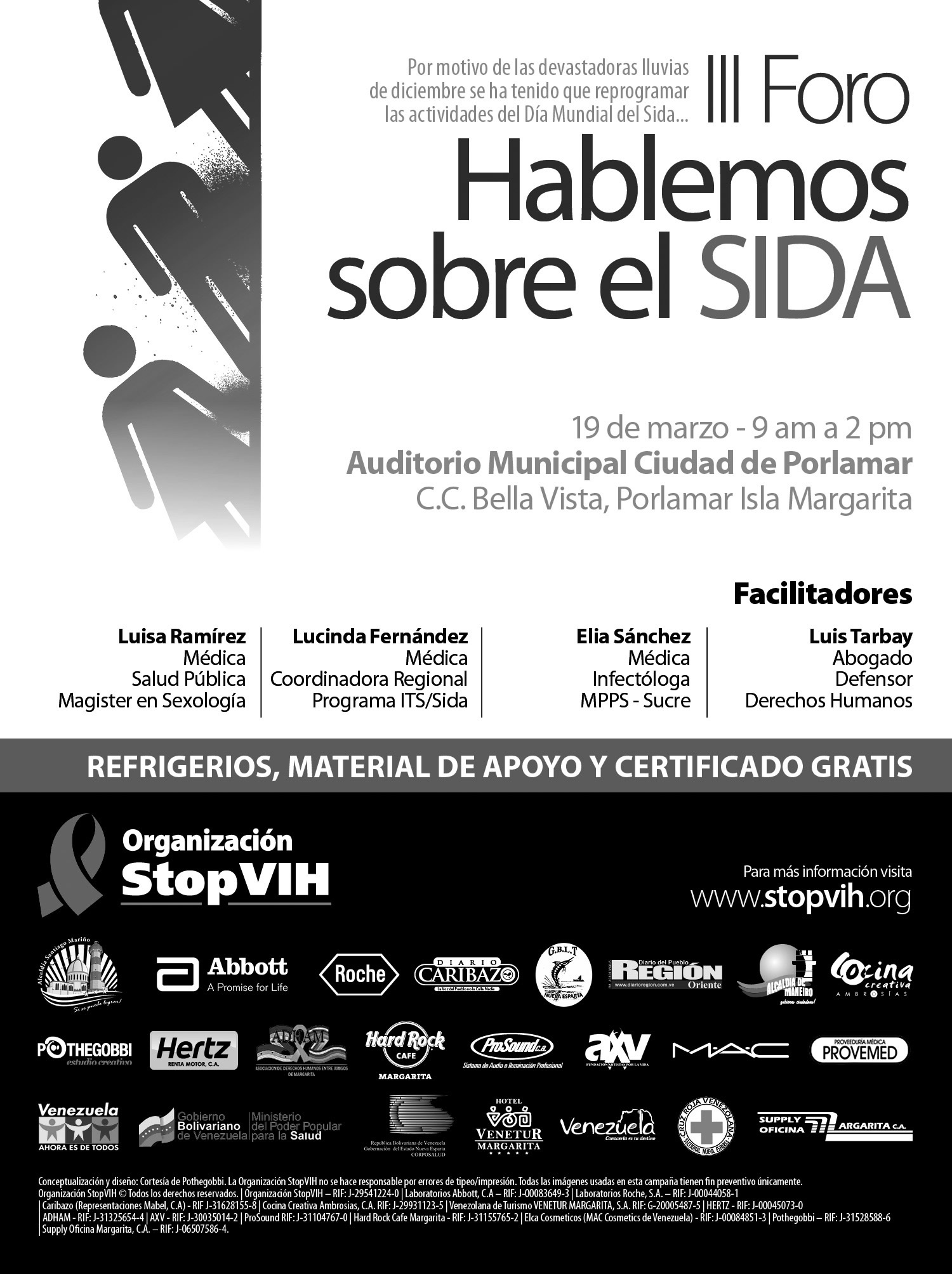 10/03/2011.- Especialistas y estudiosos del panorama actual del virus de inmunodeficiencia humana (VIH) y el síndrome de inmunodeficiencia adquirida (Sida), participarán en el III foro “Hablemos sobre el Sida”, que organiza la Organización StopVIH en la isla Margarita.
